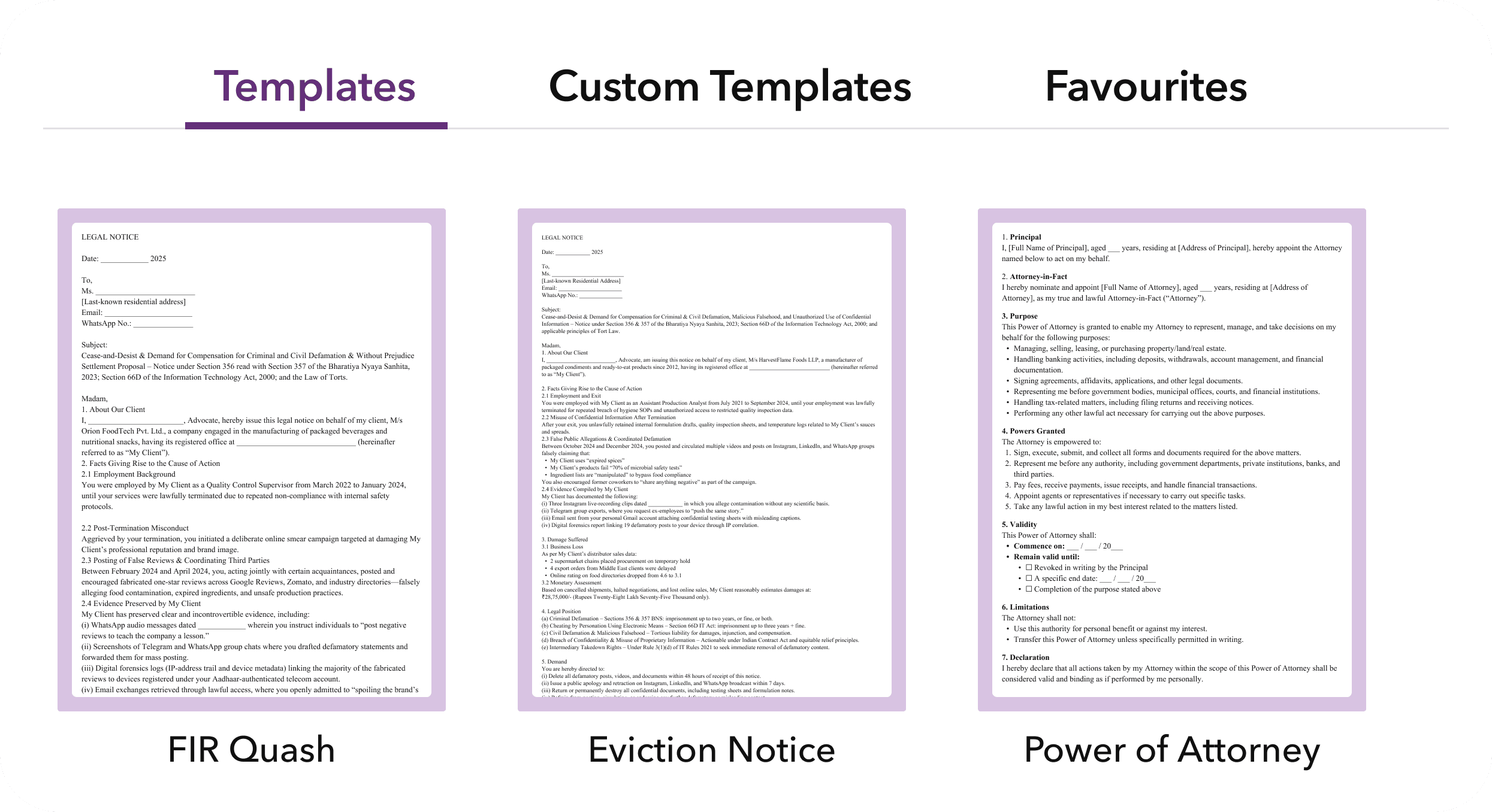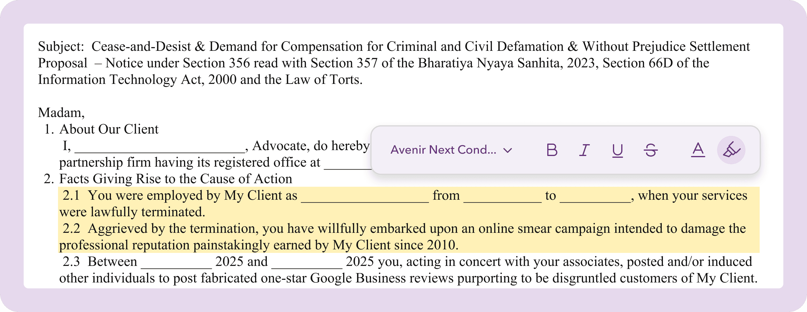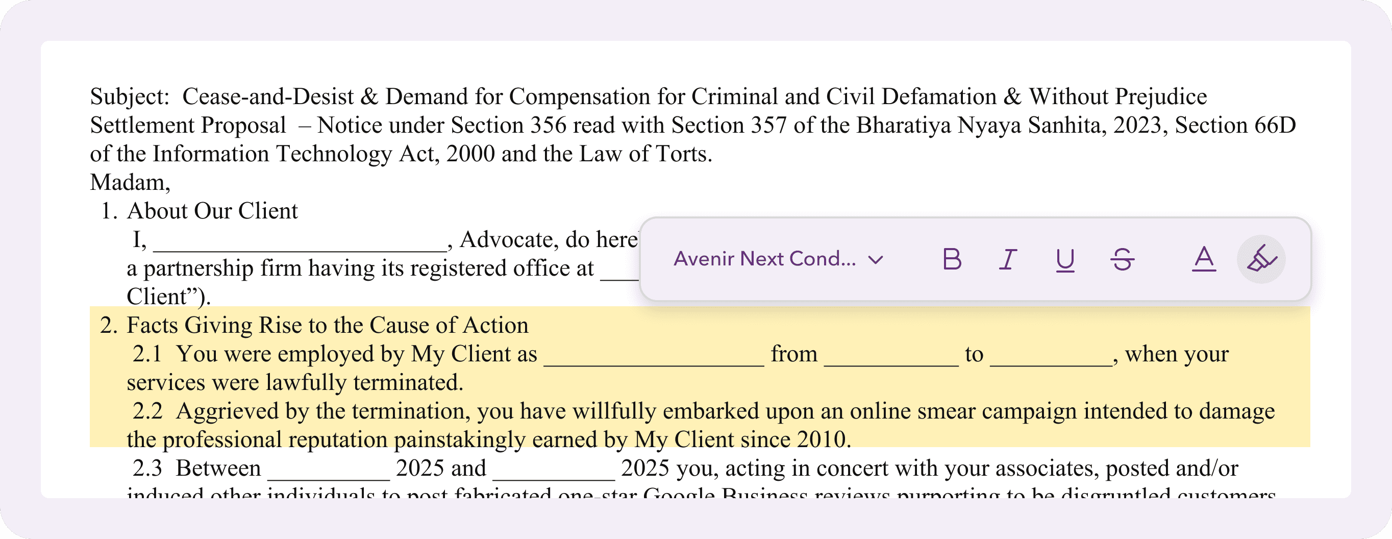 Create entire drafts with a single prompt, add clauses, full documents, and make revisions effortlessly. Vettam drafts based on your preferences, precedents and legal context.